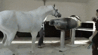 种马、猪、牛已经很习惯长得像跳马平衡木一样的女朋友了,在饲养员的循循善诱下,种马兴奋地跳上木桩,随着音乐律动甩打尾巴,饲养员伺机把假阴道对准丁丁,猝不及防地塞了进去。饲养员小声地对记者说,永远别让他们见识真正的母马,否则你懂的。