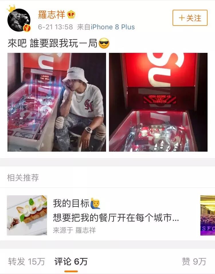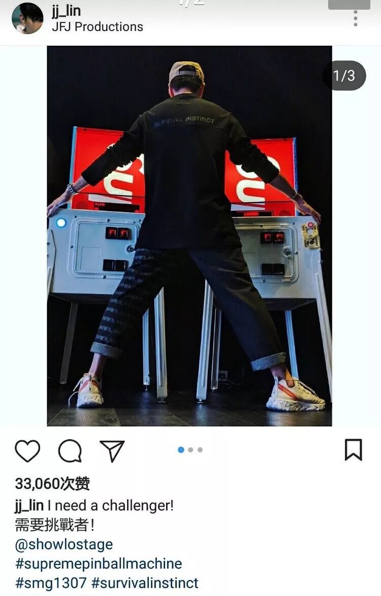 前几天林俊杰在ins上发了张和supreme的弹球机自拍带了一趟风潮,随后罗志祥也赶着发了一张把supreme的新产品巩固炒了一波。