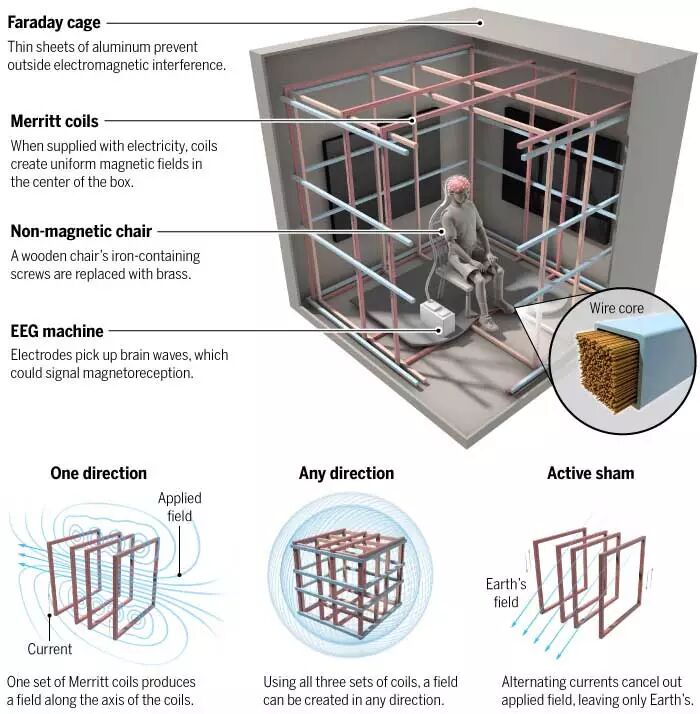 科什维克磁学实验室的隔壁就是他测试人类被试的房间。房间里摆着个四周都是薄铝板的笼子,也就是我们熟知的法拉第笼,大小刚好能够容纳一个人。这个笼子的作用是为了屏蔽外界的电磁干扰——比如电脑、电梯,甚至广播电台发出的电磁波——这些都有可能干扰实验。“法拉第笼很重要,是我们这个实验的关键,”科什维克说,“直到最近几年,这个该死的法拉第屏蔽罩安置进来之后,我们才能更好地开展试验。以前光是消除外界干扰就要大费周折,现在只要等上一分钟就好了。”