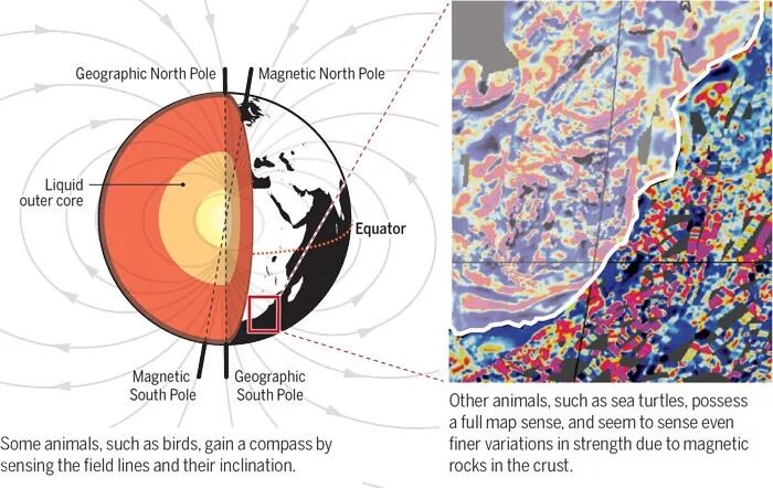 地磁场的成因在于地球的液态外核,它与偏轴条形磁铁产生的磁场类似。地磁场其实很微弱,强度大约是25微特斯拉(赤道附近)到60微特斯拉(两极附近)——磁共振成像(fMRI)时的磁场强度是其10万倍以上。某些动物,比如鸟类,主要靠感知地磁磁力线及其倾角来导航。还有一些动物,比如海龟,则能全方位地感知地磁场。它们似乎还能感应到地壳上的磁性岩石对地磁强度的细微改变。图源:G. GRUILLON/SCIENCE