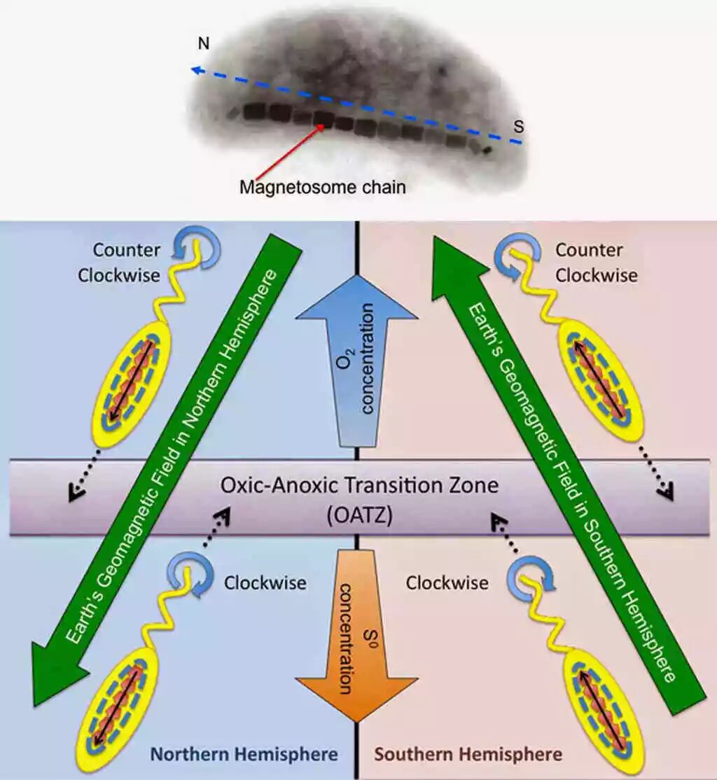 在研究科德角沼泽泥细菌的过程中,布莱克莫尔发现,当他在玻璃载片附近移动磁铁时,这些细菌会朝着磁铁冲过来。凑近些观察,他还发现,这些微生物体内携带着磁晶体锁链,后者迫使细胞沿着地磁场磁感线排列(在马塞诸塞州,地磁磁感线以70°的角度指向地面,朝向北极)。许多细菌都会利用一种名为“跌跑”(tumble and run)的运动方式,在氧气与营养物质之间无规律地寻找一种平衡状态。但是,布莱克莫尔研究的细菌就像漂浮的小磁针一样,知晓自己究竟是在泥土中向上运动还是向下运动。它们可以更有效率地在这种环境下移动,并且一旦泥土受到了扰动,它们就会迅速下潜,往深处走。