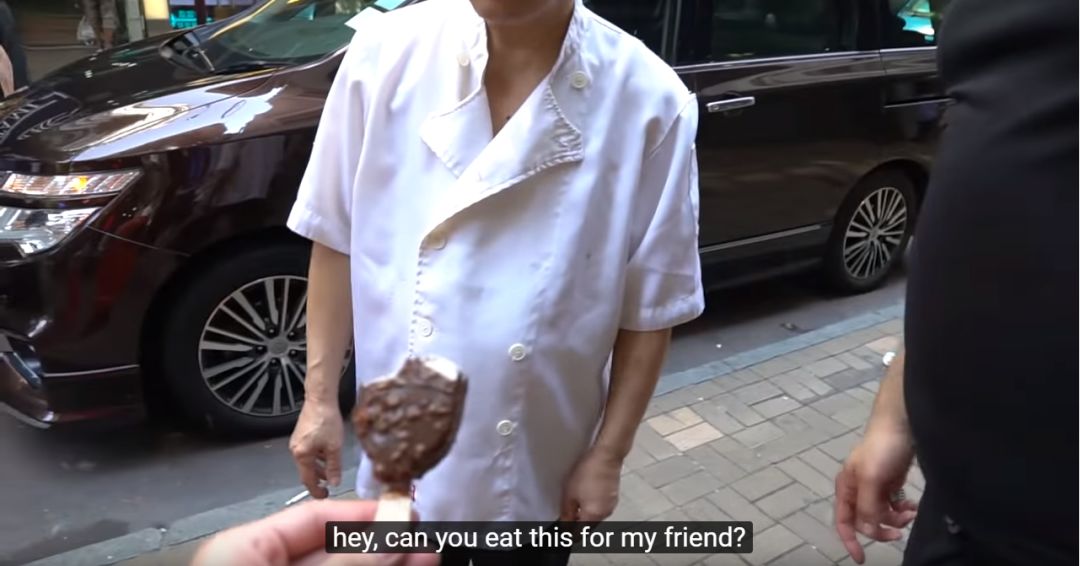 接着,Ricegum把一根吃了一半的雪糕递给一个老人让他吃,老人赶紧摆手拒绝。但面对镜头,老人不好意思不给面子,再加上Ricegum的不断怂恿,只好接过雪糕咬了一口。