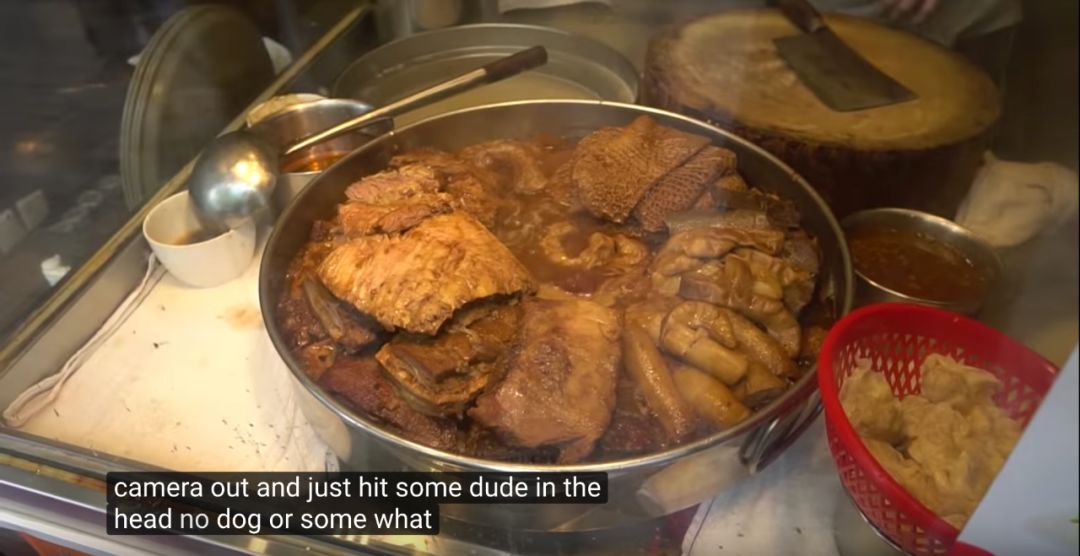 刚下飞机的Ricegum可能是肚子有点饿,于是跑到一家牛杂店问店主: