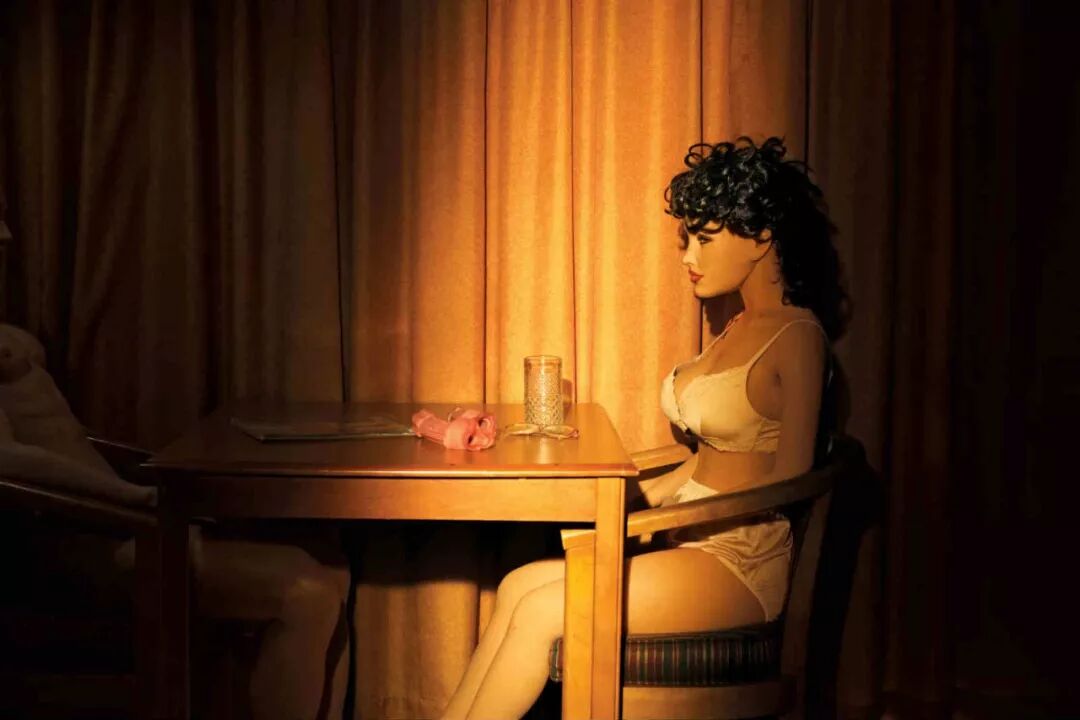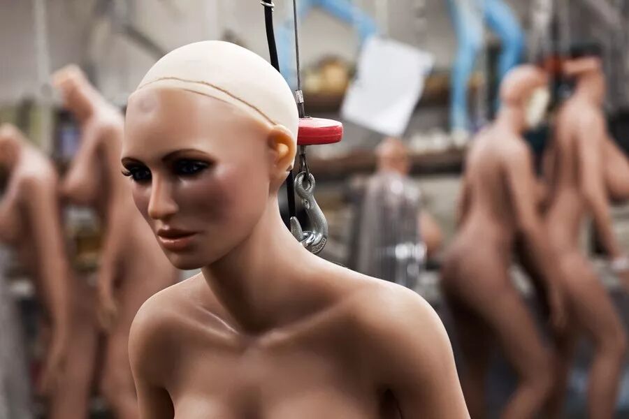 凯瑟琳将我带回到一间展览室中,一群真人娃娃在那里等着,双眼光亮透明而呆滞,光滑的黑色硬木地板上散落了她们肉体的原材料——硅胶;我穿着休闲鞋,屡屡滑倒,只好抓住一只性爱人偶来保持平衡。我见到的第一个人偶是利拉(Leila),她是金发碧眼的美女,脸上带着定制的雀斑,身上“衣著齐全”,穿着白条纹比基尼,站立时身高一米五(我说的“站立”,是指受巨大的人偶支架支撑——这些真人娃娃都不能自行移动,但她们身肢柔软,可以摆放成各种姿势)。接着是塔尼娅(Tanya),她光着身子,没戴假发,昨天晚上被租出去用于派对,结果还回来时身上一团糟,衣服被损坏了,全身脏兮兮的。凯瑟琳说,“我得把她洗干净”。我还见到了诺娃(Nova),她坐在真皮躺椅上,没法让自己的两个眼珠在一条直线上,还有斯托米(Stormy),是按美国情色演员斯托米·丹尼尔斯(Stormy Daniels)本人的模子来制作的性爱机器人。