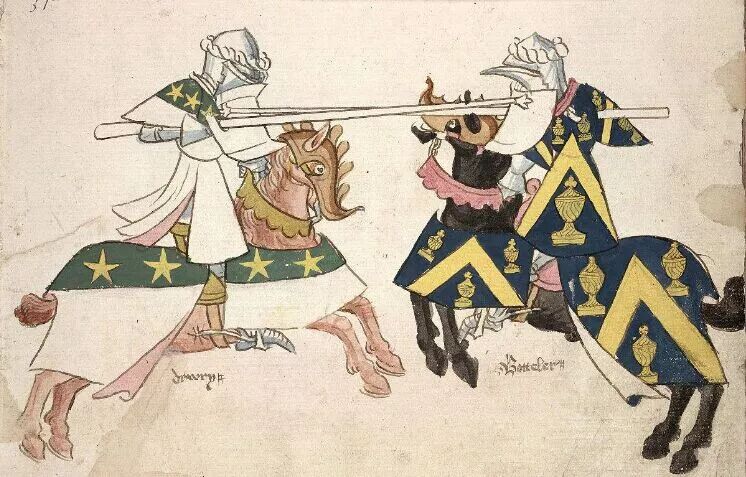 1066年除了是诺曼征服之外,还发生了另一件事,一个今天已经被遗忘的人——普雷伊的若弗鲁瓦死了。这个人其实是中世纪最应永垂史册的人之一,因为他制定了骑士比武的规则,中世纪最高大上的游戏诞生了!在骑士比武方面法国人是游戏规则的制定者,也是话语权的掌握者。这一点可以从中古德语中看出端倪:一些基本装备的词汇都是传统词汇,比如盔(helm)比如剑(swert),但是骑士时代新发展出来的物品的词汇几乎都是从法语直接拿来的,例如头盔前面保护面部的那个护面甲,在德语里用的就是法语外来语,头盔装饰也是法语。而且法语中用来称呼骑士长矛的词Lanze还取代了德语中传统的Spiez。战斗或许是各民族的天赋技能,但是像骑士那样战斗,像骑士那样优雅地战斗,这纯然是法国人的发明,德国乃至整个中欧都是从法国人那学来的。