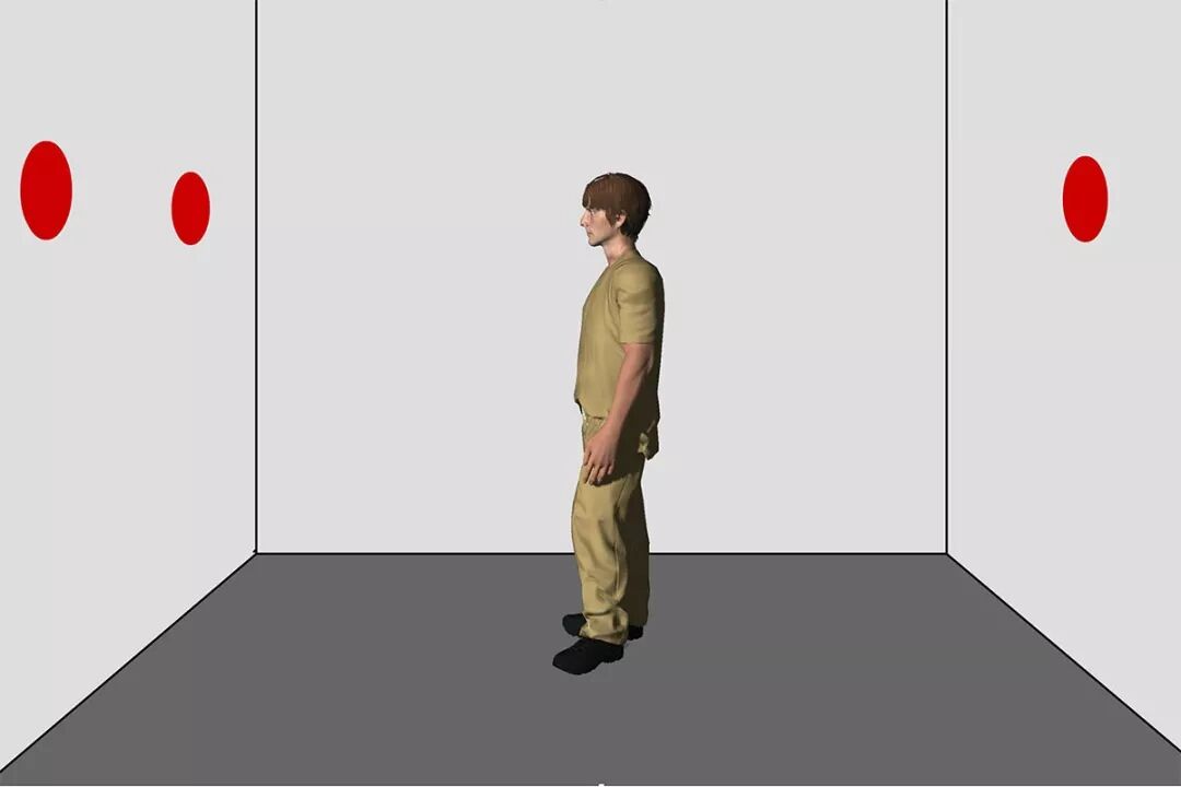 在一部分房间中,有两个红点在虚拟人面前的墙上;在另一部分房间中,有一个红点在虚拟人面前的墙上,另一个则在其身后的墙上。图源:New Scientist