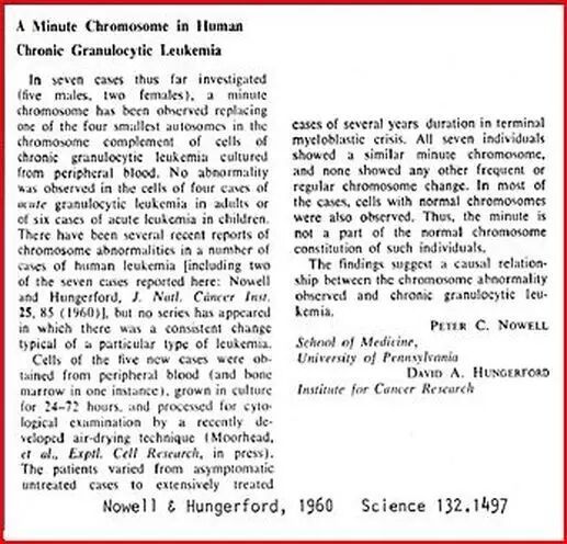 1956年,一名叫做彼得·诺维尔(Peter Nowell)的年轻人从海军退役,回到了故乡费城。在那里,他加入了宾夕法尼亚大学病理系,主攻白血病和淋巴瘤的研究。