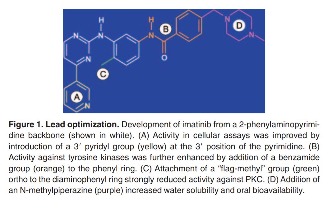 在这个化合物的基础上,研究人员们做了一系列的合成尝试,不断优化这一分子的特性:在嘧啶的3号位上添加的吡啶基团能增加其在细胞内的活性;苯环上添加的苯甲酰胺基团能增强对酪氨酸激酶的抑制能力;苯胺基苯环6号位的修饰进一步增强了对酪氨酸激酶的抑制;N-甲基哌嗪的侧链添加则极大地改善了这个分子的溶解度,使得口服用药成为可能。