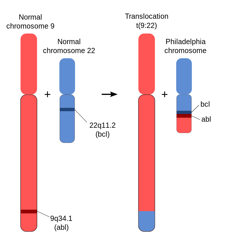 ▲费城染色体的致癌原因(图片来源:By Aryn89 [CC BY-SA 4.0 (https://creativecommons.org/licenses/by-sa/4.0)], from Wikimedia Commons)