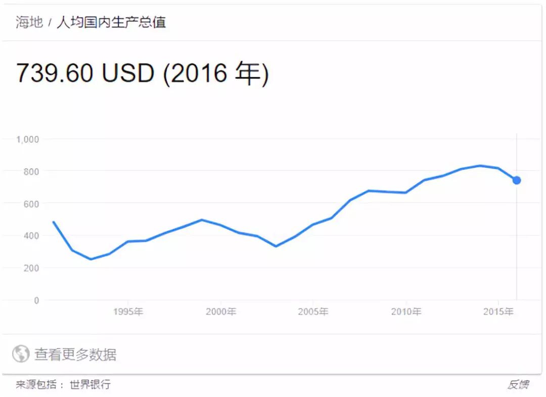 人类发展指数HDI(2017年)是由联合国开发计划署发布,衡量一个国家贫困水平的指数,包括“预期寿命、教育水平和生活质量”三项基础变量。拉美地区国家大多数具备一个较高或者中等的HDI,只有海地排到第163位。据世界银行资料,海地2016年的人均GDP仅为739.6美元。