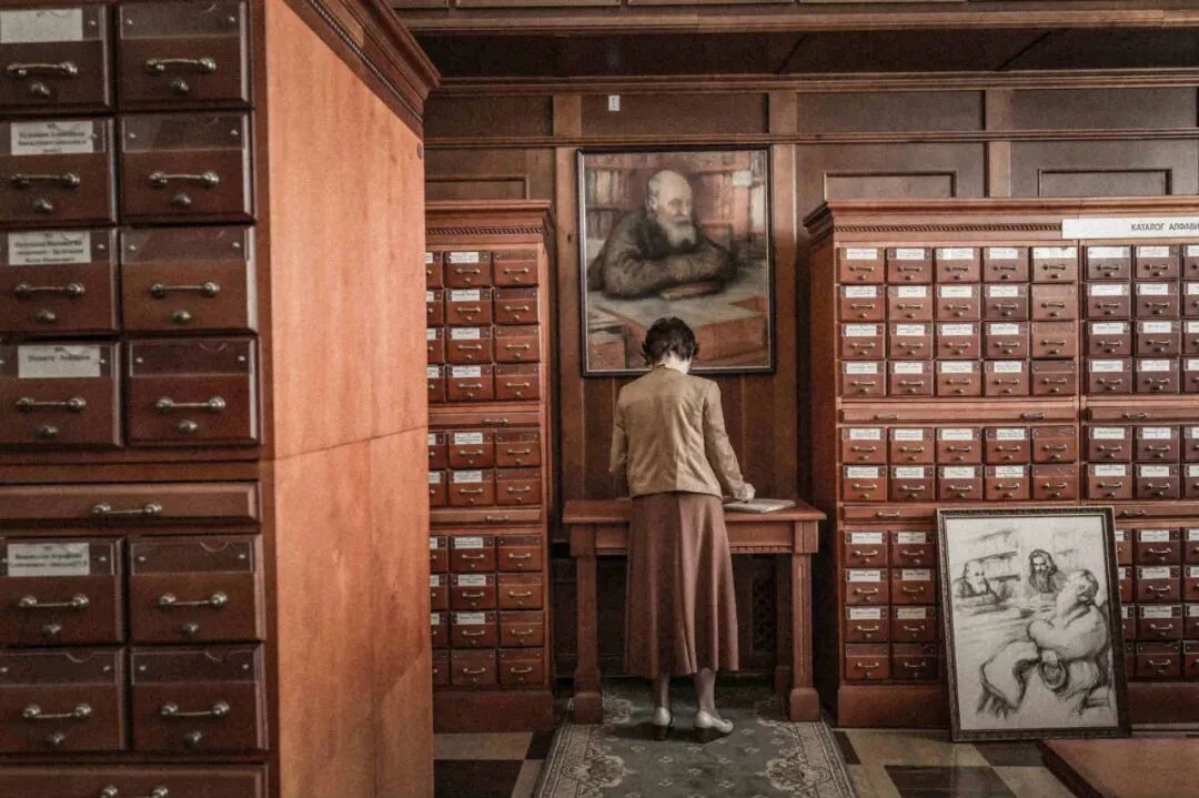 萨洛米诺·奥尔加(Salomino Olga)在莫斯科的俄罗斯国家图书馆工作。她站在宇宙主义者尼古拉·费奥多罗夫的肖像下方,整理关于他的文件。费奥多罗夫生前也在该图书馆工作。