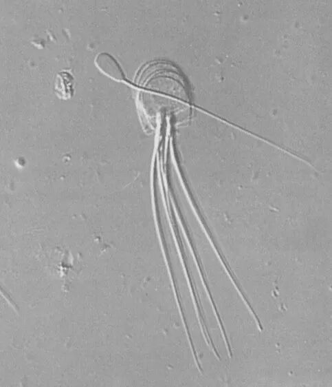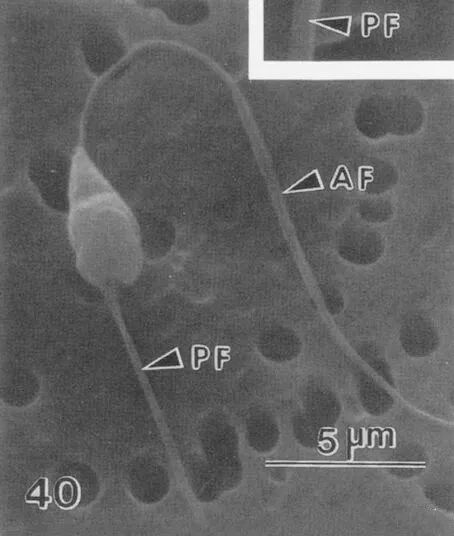 ▍红娇凤凰螺的辅助精子(中间)和正常精子(小蝌蚪)