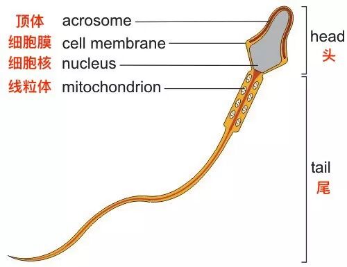 这只蝌蚪可分为四个部分,顶体、头部、中部和尾部,最前端的顶体负责释放顶体酶,用来融化进入卵子的通道,头部装载最重要的遗传物质,中部则存放线粒体以供能,细长的尾部提供前进动力。