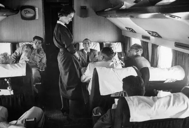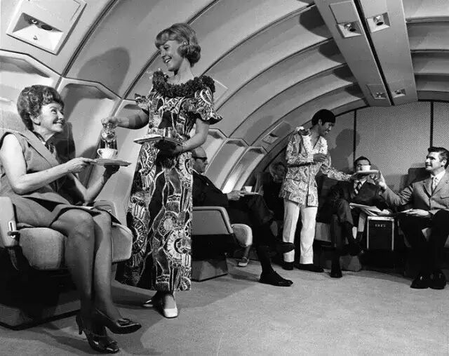在那个美国航空业的奢华时代,坐飞机仍是名流和富商的特权。乘客可以在飞机上享受舒适的卧铺、豪华飞机餐、甚至现场钢琴表演。