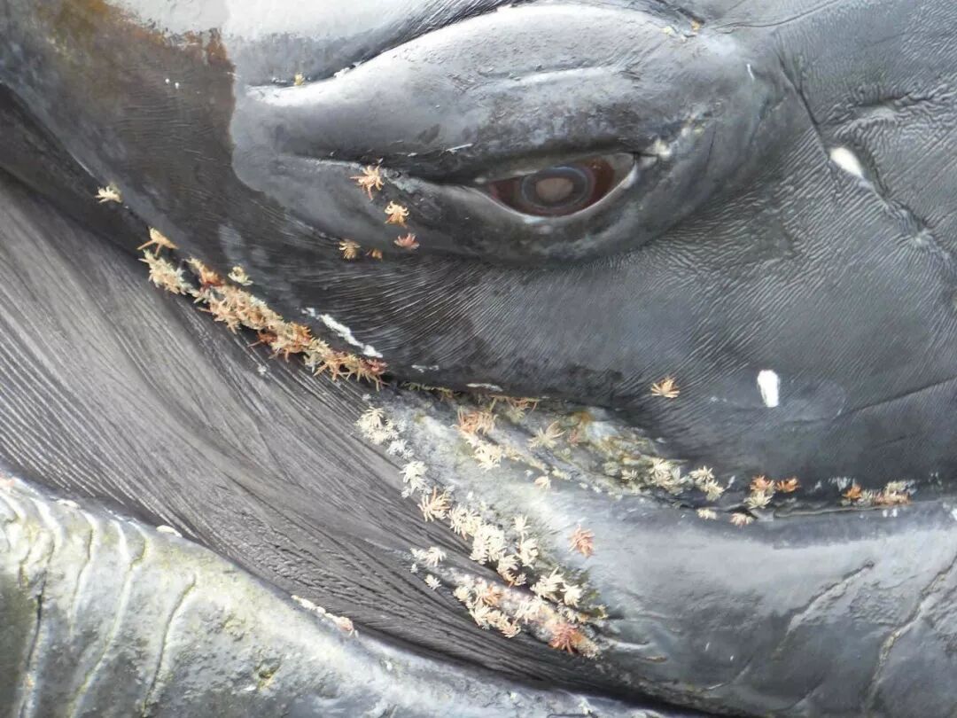 不过,对于游速相对缓慢的鲸来说,鲸虱很容易生存。常见的寄生部位包括鲸的皮肤伤口、生殖器褶皱、口腔边缘、鼻孔、眼睑和鳍褶。在游动速度较快的齿鲸身上,鲸虱数量相对较少。你或许会担心,这么多虱子寄生在鲸身上,会对鲸健康造成伤害吗?答案基本是否定的:鲸虱给宿主只会造成微小的皮肤损伤,并无大碍。