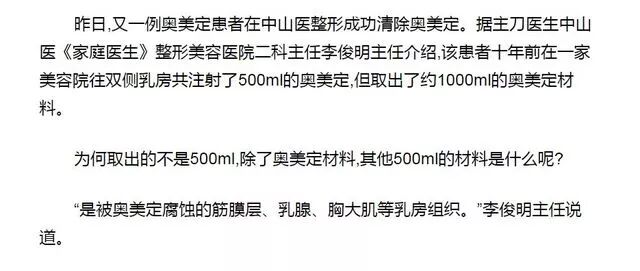 除了盐水袋假体,还有一种叫做奥美定(聚丙烯酰胺凝胶)的假体,也是非常的有毒。完全就是一颗放在隆胸女性胸前的不定时炸弹,下面这个案例也只不过是万千惨剧中的一个