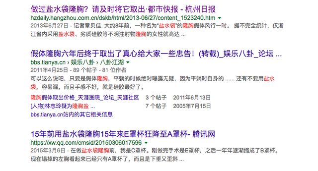 1965年,法国人H.G. Arion 医生首次尝试将一个充满消毒盐水溶液的硅胶液囊植入胸部,这就是世界上第一个盐水袋假体。在九十年代里,盐水袋假体一度成为全球女性使用最多的隆胸假体材料,十几年前它更是盛行于中国。而如今,让我们随便打开一个浏览器,搜索“盐水袋隆胸”,除去那些关于林志玲坠马把胸摔碎的报道,所看到的东西是