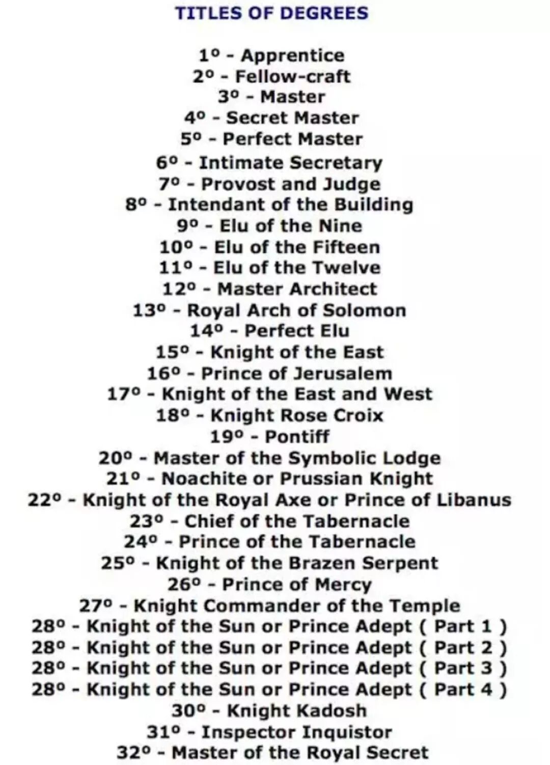 尽管共济会体量庞大,但按最典型的苏格兰礼(Scottish Rite)共济会体系,会员共33级(或称“度”)之分,其中第1和2级是普通会员,只是个重在参与,享受不到什么实质性内容。