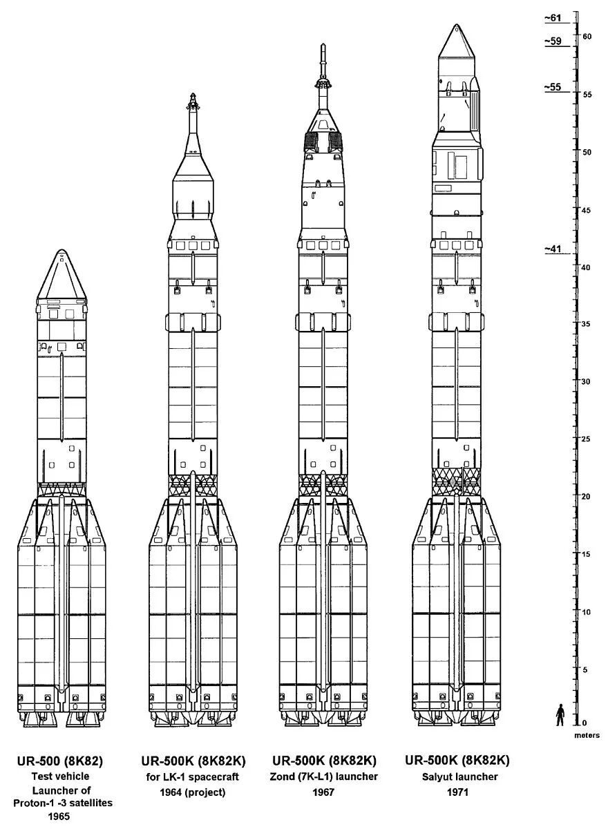 几种质子号火箭,从左到右依次为:UR500,质子-K,质子-K/D组级,发射礼炮号空间站的质子-K。质子号火箭更为突出的问题是其使用的液体推进剂偏二甲肼/四氧化二氮有毒,一旦发射失败,泄漏的推进剂可能对环境造成污染。俄罗斯经常因火箭在发射后坠毁而与发射场地的所在国哈萨克斯坦进行交涉。图源:wikipedia