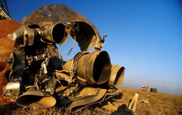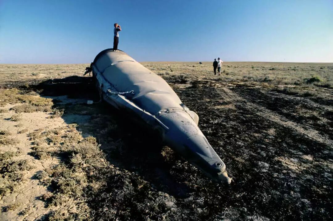 最近坠毁的俄罗斯联盟号太空火箭助推器残骸散落在草原上。图源:乔纳斯·本迪克森/玛格南图片社