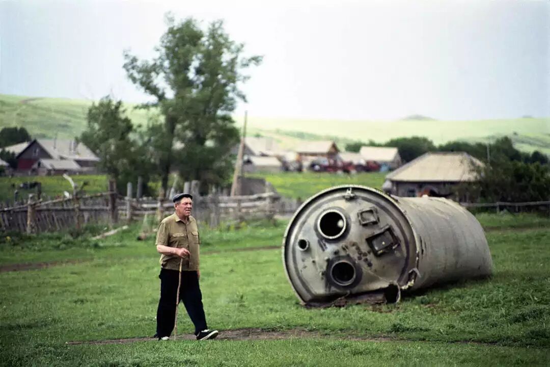 傍晚,一位农民散步时经过联盟号宇宙飞船残骸。在这个以农业为生的村子里,火箭残骸经常会坠落到村民的后院。图源:乔纳斯·本迪克森/玛格南图片社