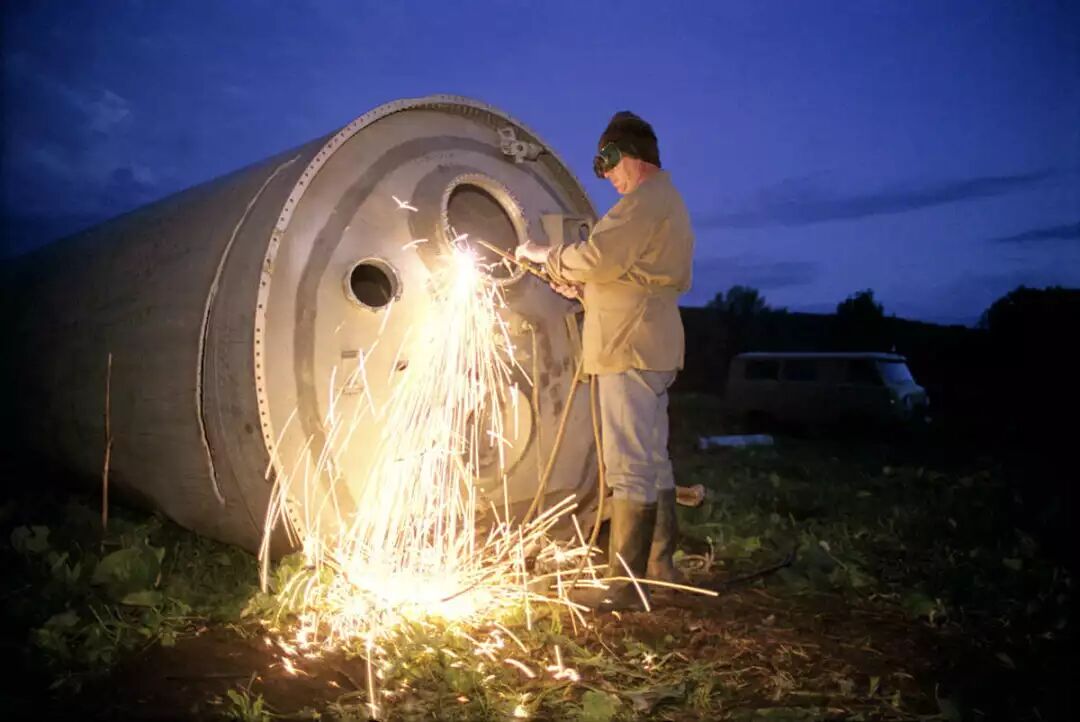 当地一位居民正在切割火箭残骸,以售卖其中的高级钛合金。图源:乔纳斯·本迪克森/玛格南图片社