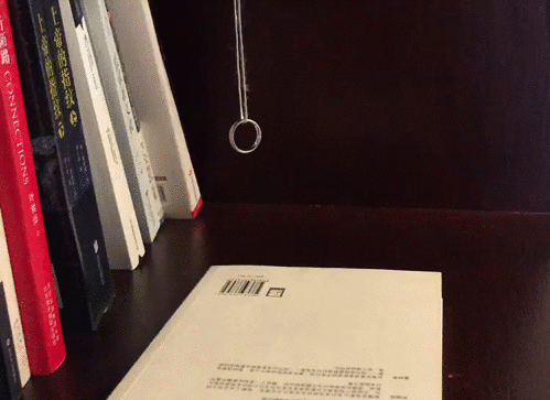 第二个实验:我拿一根线,绑上一枚戒指,放在金字塔上方,戒指在金字塔上面轻微晃动。