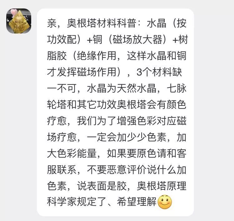 关于它强大功能的来源,热情的卖家先给我介绍了奥根能量金字塔的材料: