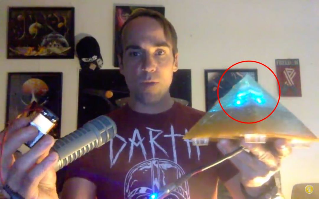 詹姆斯的证明方法就通俗多了,他把一个金属块用绳子吊起来,拿在手上,然后放在奥根金字塔上方。
