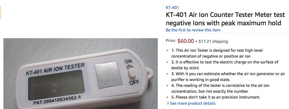 由于这玩意的价格超过了经费的预算,我只能作罢。就这款产品,我咨询了驻扎在亚特兰大可口可乐大学医学院分部的同事,他很负责地说,这玩意是测负氧离子的,一般是判断空气质量是否良好的产品。