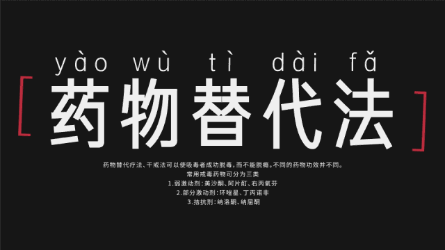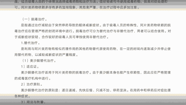 从这份卫生部印发的针对鸦片、吗啡、海洛因等阿片类毒品的诊断治疗指导原则中,我们可以看到,“替代法”就是让戒毒者用美沙酮、盐酸丁丙诺啡等药理相似,且毒性、依赖性较低的药物替代原吸食毒品,并逐渐减少直到停药,一般可在 20 天内帮助戒毒者平稳度过戒断反应期。