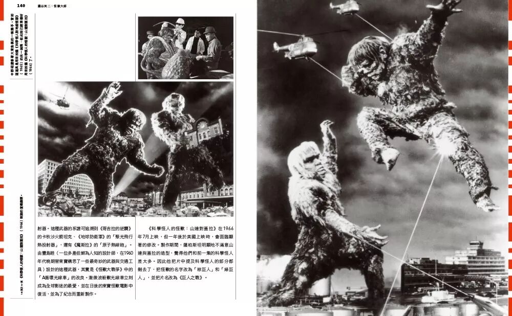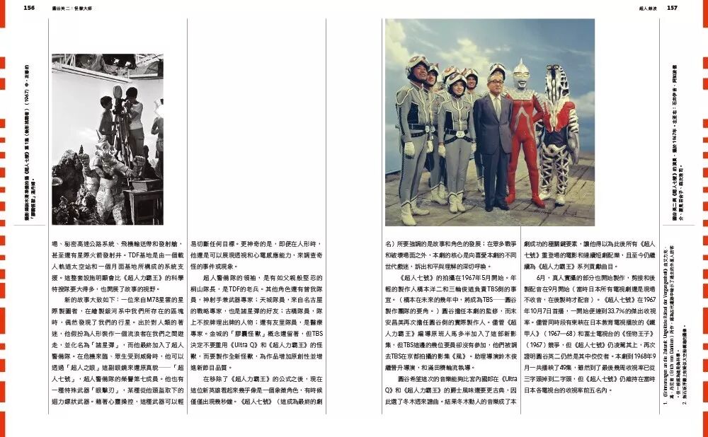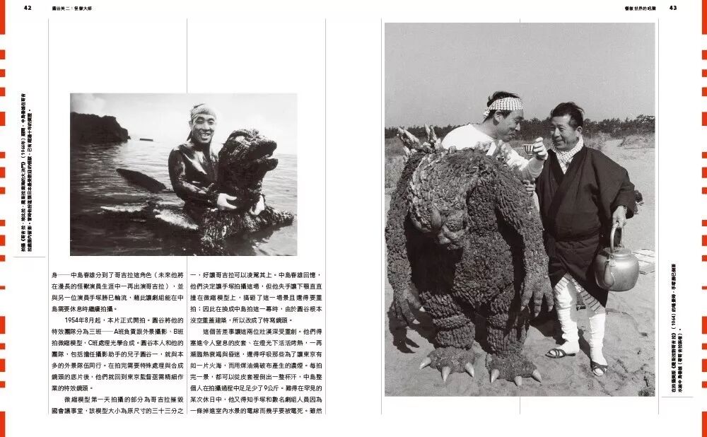 在《怪兽大师圆谷英二》一书里,记录了圆谷英二开创特摄手法制作电影的幕后故事。从《哥斯拉》到《宇宙英雄奥特曼》,上百张难得一见的幕后侧拍纪录、剧照、电影海报,不仅细说每个角色造形艺术,更收录圆谷现场指导怪兽破坏一栋栋建筑的大量精彩照片,并纪录下合作团队的人物侧写。