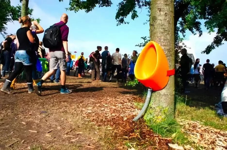 为了缓解人们上厕所的压力,音乐节组委会研制出了绑在树上的男士小便池。