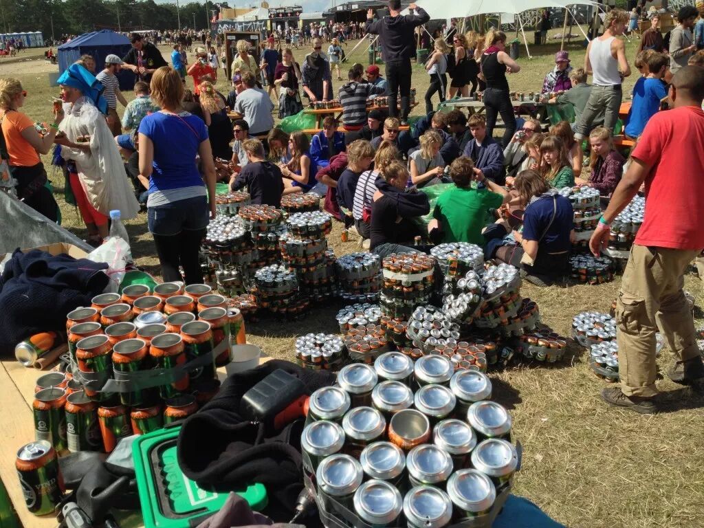 为了挣这帮丹麦酒鬼们的钱,音乐节上每年都有几百个酒摊,还有专门买门票进音乐节现场回收各种酒瓶、易拉罐的低收入人群。铝罐或塑料杯都回收,一人民币一个。有个常年在Roskilde音乐节上专职捡酒瓶饮料瓶的人员工作四天,月入上万。