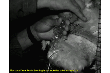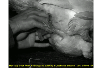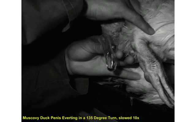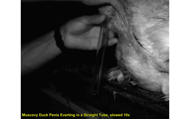 答案是:丁丁是软的,具有流体的性质,对准之后,丁丁会像一个弹簧一样弹进母鸭子体内,仅耗时 0.36 秒,随即射精,之后一秒钟就可以收回(工程力学的同学可以好好研究一下,应用前景很广,比如自动收雨伞)。丁丁可以自由探索母鸡的阴道,并根据地形调整方向。丁丁进的越深,精子排放的地方越深,就更有可能当爹。