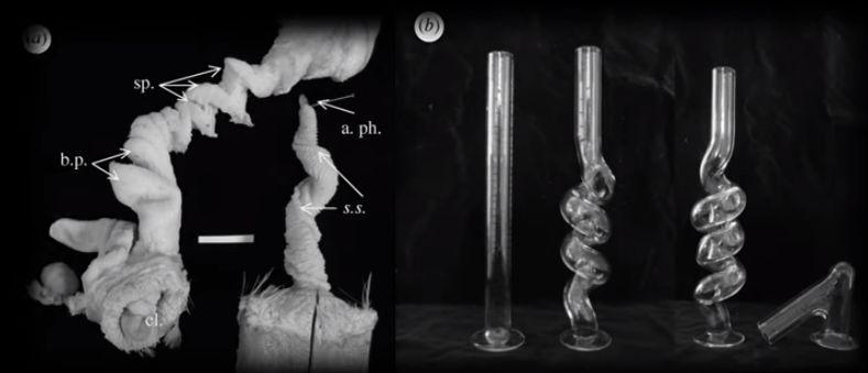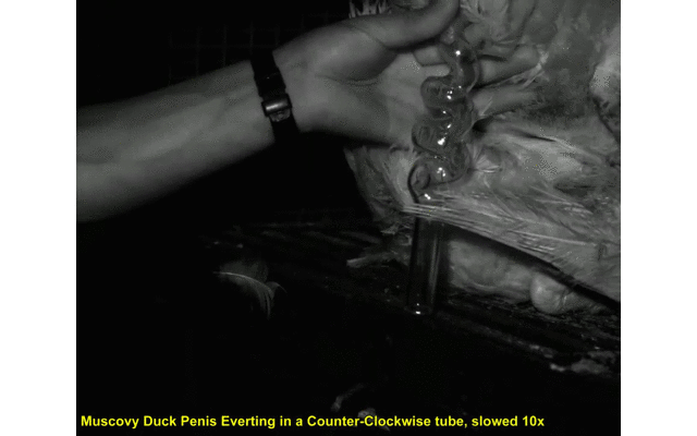 实验人员设计了四种容器(图b),第一种是直的,实验结果表明鸭子可以收缩自如,虽然有时候丁丁会收不回去,但这就是长(chang)丁丁的代价,第二种是逆时针,一切顺利,第三种是顺时针(模仿阴道),第四种是 135 度大回转(模仿阴道),因为母鸭子生殖道入口有一个大转弯。