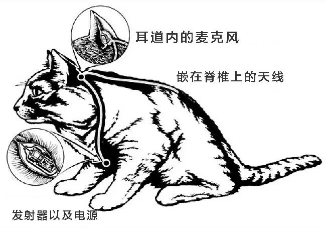 最后他们在猫的头骨底部植入了一个3/4英寸(约1.9厘米)长的发射器,在耳道中直接插入了微型麦克风。电池被放置在胸腔里。一根细电线融进毛皮里,从脖子下面,一直延伸到尾部,以用作天线。