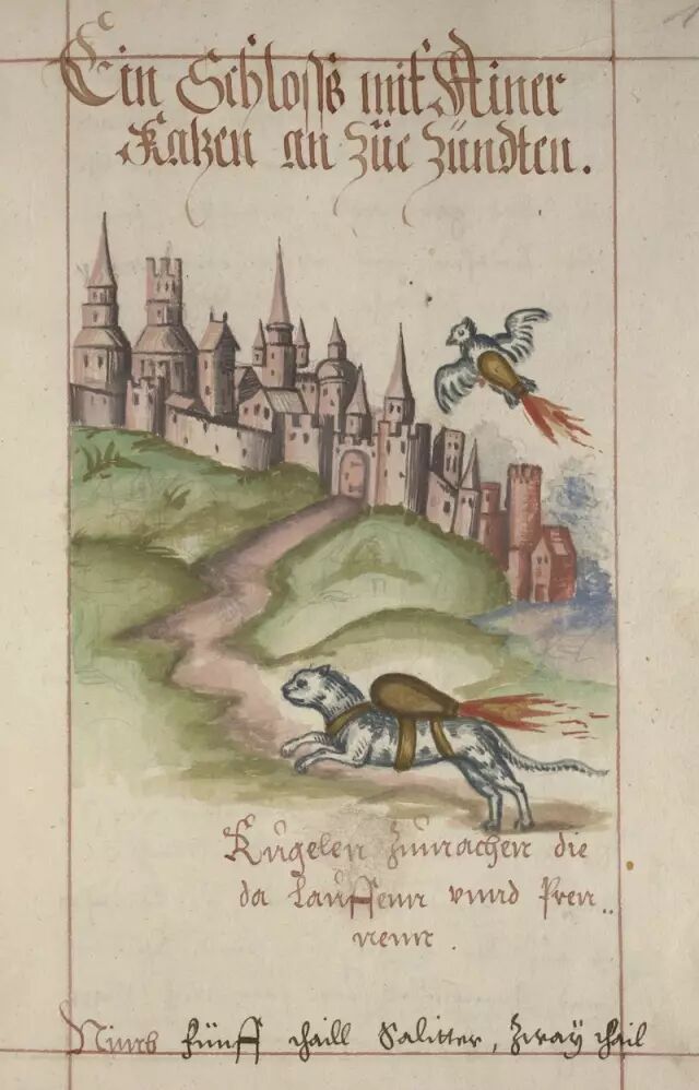 猫被用于军事,历史上并不罕见。该插图出自于十六七世纪被反复抄写、改动的早期炸药及作战手册。科隆的炮兵长弗兰兹·海尔姆(Franz Helm)是构想如何使用猫型及鸟型炸弹的第一人。图源:宾夕法尼亚大学,编码:Ms. Codex 109, f137r.