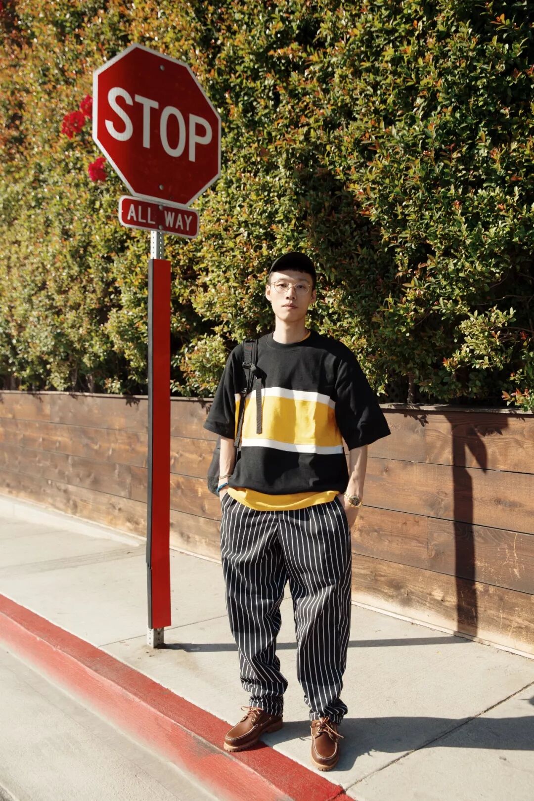 间色横纹t恤搭配复古黑白竖条纹萝卜裤,花式相互呼应且不显繁杂。细节处,船鞋、棒球帽、金属框眼镜、金属腕表都是能提高整体搭配复古感的优质配件。