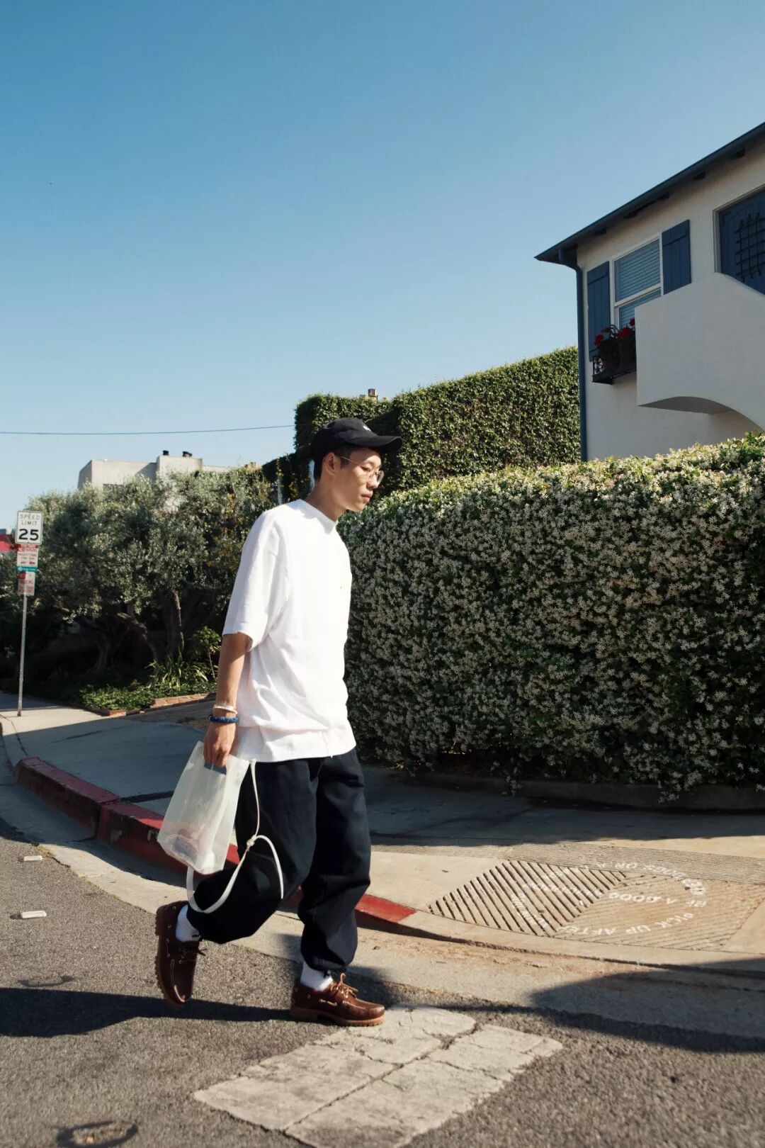 聪明人应该看出来了,比自己体型大两个size的t恤,肥大裤筒逐渐往脚腕处收小的裤型,一双白色长袜,和一对船鞋,就是变身City boy绝不出错的公式。