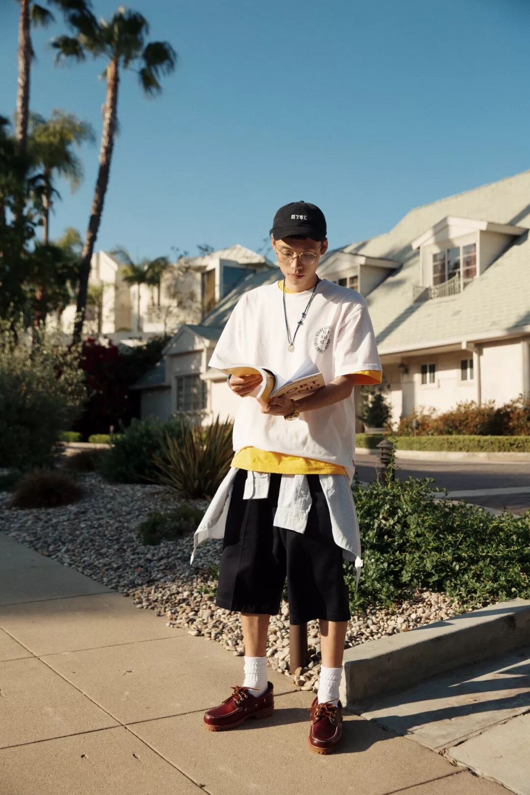 oversize的t恤或外套,下身搭配宽松工装裤,再穿上一双复古气息爆棚的经典款船鞋,就能立马变身为一个基本款的复古City boy。