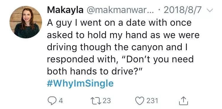 有一回,我约会的男孩想要牵我的手,当时我俩正开车穿过峡谷,我问他:“你不得用俩手开车吗?”