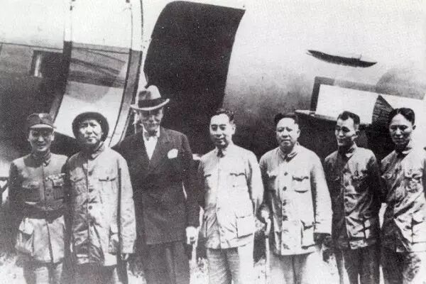 除了毛周以外,这张照片上几乎都是名人。从左侧数,是“和平将军”张治中、毛泽东、美国特使赫尔利、周恩来、王若飞、胡乔木,最后一位,是毛泽东的贴身警卫陈龙。
