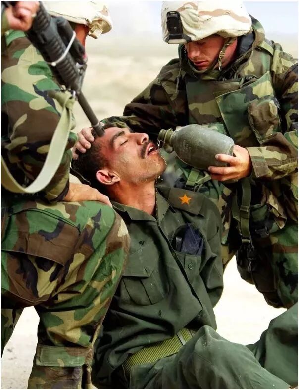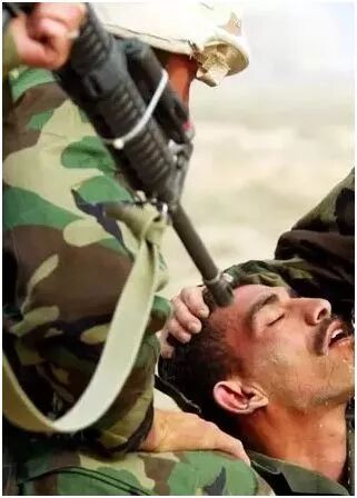 这是伊拉克战场上面的一张照片,被国际媒体记者炒作后,迅速成了军队“虐待囚徒”的事件,群情激奋。