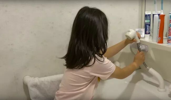 一般的洗手台的水龙头位置都是固定的,但是日本人设计的这个水龙头可以直接拉起来。