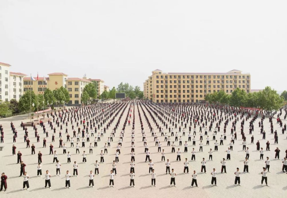 河南这个武校,因为人太多,只能一半人在外面练武,一半人在教室里上文化课。我找到5000个同学在操场上练习武术,然后拍摄这张照片。