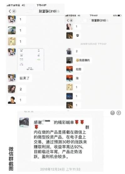 起初,何先生也只是旁观者心态,认为加个群看看无所谓,而且已坠入桃花迷魂阵中的他对于“美女”的要求是千依百顺。但群内连续多日的投资盈利消息,让何先生再也按捺不住。群里的网友“注金”5000元后,按照群中“分析师”“预测师”所谓的“投资策略”,不到一分钟,收益可以高达1000余元。
