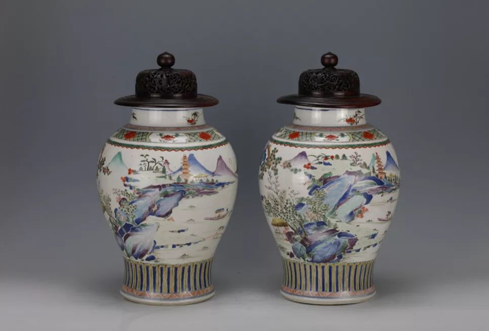 清雍正 粉彩山水纹将军罐一对(带木盖)
