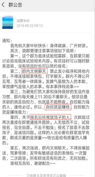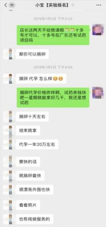 QQ和微信上的试药人加多了之后,P哥便根据他们的身份划分了不同群聊:大学生群,日结工人群,全都是女性的群等。P哥在这些群里宣传试药项目,同时也定下群规:不准发布卖血、借贷、捐卵、援交等信息。一旦有人发布,就会被勒令撤回并发出警告:“若有第二次,直接踢人。” 但是,像P哥一样“干净”的中介是少数。更多的人“身兼多职”,在招募临床试验受试者的同时,伺机寻觅卖血、借贷、捐卵、代孕者。