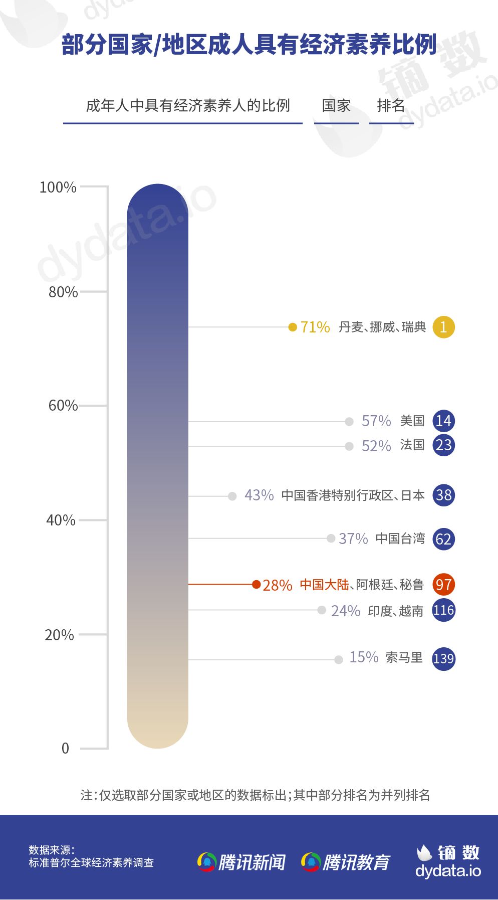 2014年,标准普尔(Standard & Poor's)对超过140个国家,150000成年人,以风险分散、通货膨胀、利息和储蓄复利4个版块为题,做出经济素养调查。